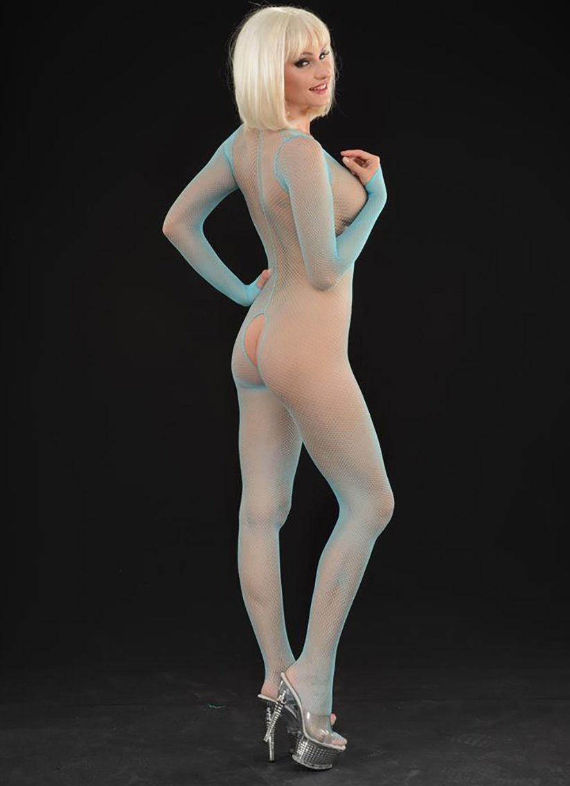 Комбинезон-кэтсьюит на все тело, из мелкой сетки. Спереди глубокий вырез ниже пупка. Зона бикини открыта. Длинные рукава с петлей на палец.