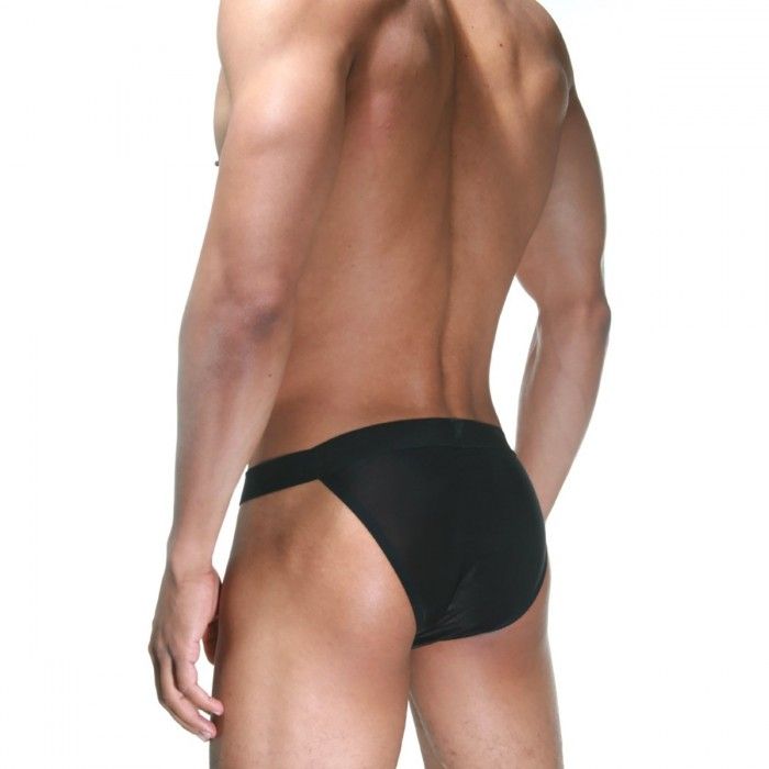 Черные трусы-танга для мужчин с низкой посадкой, на широкой резинке. Спереди розовая небольшая рюша.