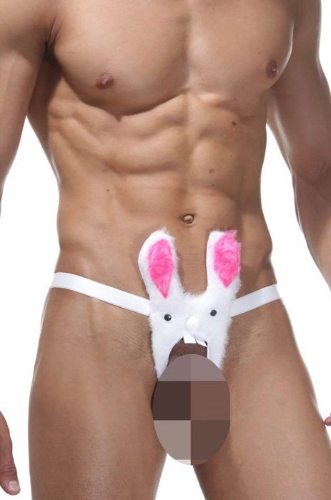 Эротичные трусы белого цета с доступом. Спереди - забавный заяц с розовыми ушами, сзади - полосочка-стринги. Трусы хорошо тянутся.
