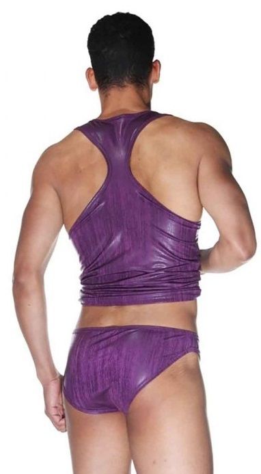 Комплект для мужчин, состоящий из майки и трусов-слипов. На трусах серебристая молния, весь комплект из мягкой, гладкой, блестящей ткани. В комплекте: майка, трусы.