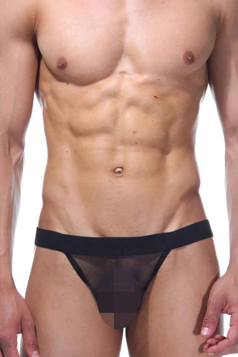 Мужские трусы из полупрозрачной ткани, с интимным вырезом спереди, на широкой резинке. Сзади трусы имеют оригинальный дизайн из тонких резиночек.