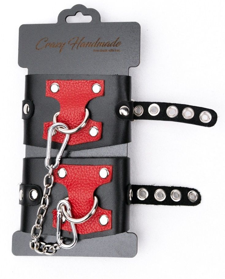 Кожаные наручники с контрастным декором и заклепками имеют кольца для крепления и металлическую сцепку.