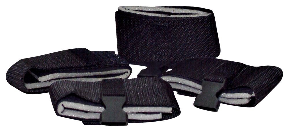 Комплект для связывания. В комплекте 2 черные ленты (длина каждой 320 см), которые соединяются под матрасом с лентами (длина 180 см) с подбитыми лентами для рук и ног, которые регулируются ремнем.